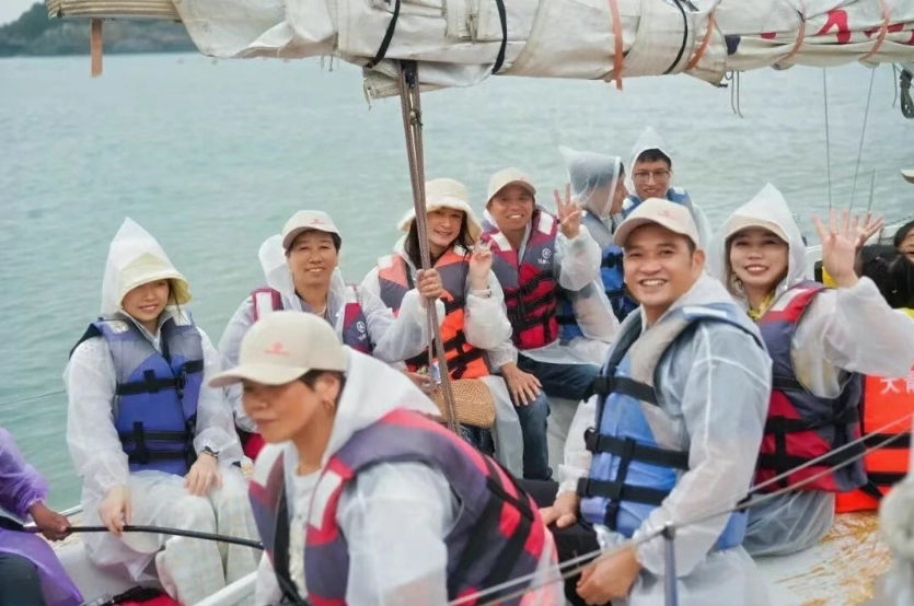 Al llegar a su destino, todos se registraron primero en el Área Escénica de Zhujiajian Dachengshan. Luego, recorrieron el sinuoso sendero de montaña para disfrutar del paisaje isleño. Capturaron momentos de juventud en el popular puente flotante. Pasearon por la playa y sintieron la suave caricia de la brisa marina y el abrazo de las olas.