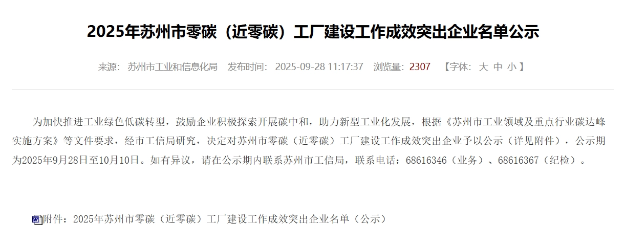 Con el fin de implementar la estrategia nacional de "neutralidad de carbono" y acelerar la transformación verde y baja en carbono del sector industrial, alentar a las empresas a explorar y llevar a cabo activamente la neutralidad de carbono y apoyar el desarrollo de una nueva industrialización, la ciudad de Suzhou publicó recientemente la "Lista de empresas con logros sobresalientes en la construcción de fábricas de carbono cero (casi cero carbono) en 2025".