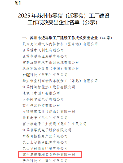 Tras una rigurosa revisión y selección, Suzhou AODE Precise Equipment Co., Ltd. (en adelante, "Aod e ") fue incluida en esta lista gracias a sus prácticas sobresalientes y logros notables en fabricación ecológica y ahorro de energía. Esto demuestra que la empresa ha dado pasos firmes en la senda del desarrollo sostenible.